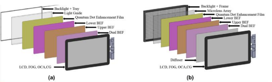 Figure. LTS’s LCD display stack, (a) Edge-lit and (b) FALD typical film arrangement